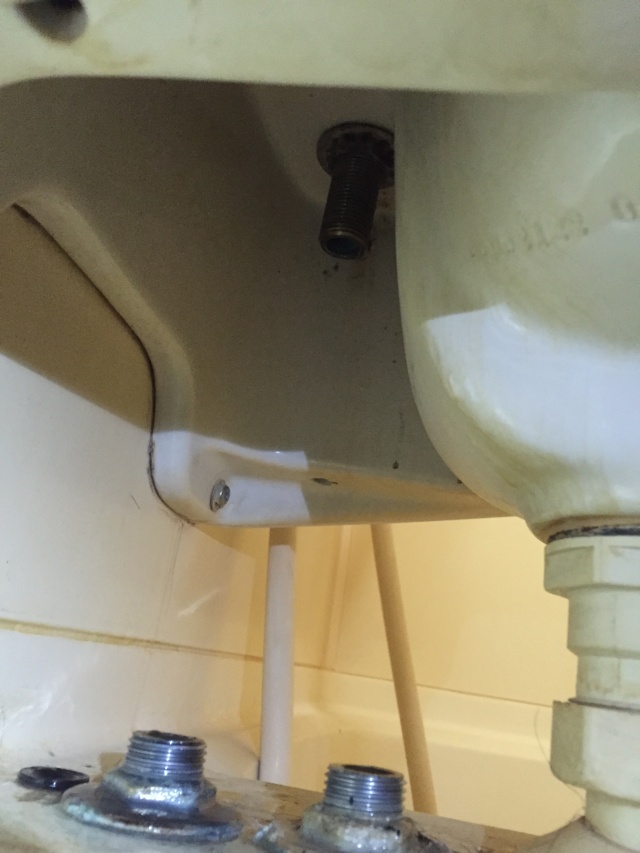 これはユニットバス用の手洗い陶器の下側、20年以上経過の現場で蛇口のフレキが外れなくて困っていました。