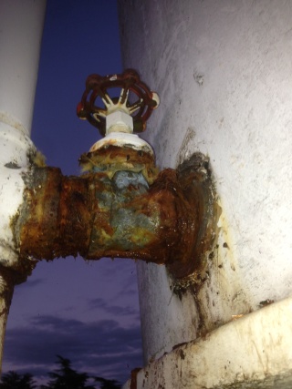 漏水箇所はこのバルブあたりからです。バルブに亀裂は見られず、しかも長い間閉められたままとのことなので、高架水槽とバルブの間のニップルが腐食して漏れているとみて間違いありません。