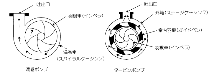 渦巻ポンプは遠心ポンプに当たります。カスケードポンプは遠心力を利用しているので遠心ポンプの一種とも言えますが、構造上仲間に入れない場合もあります。