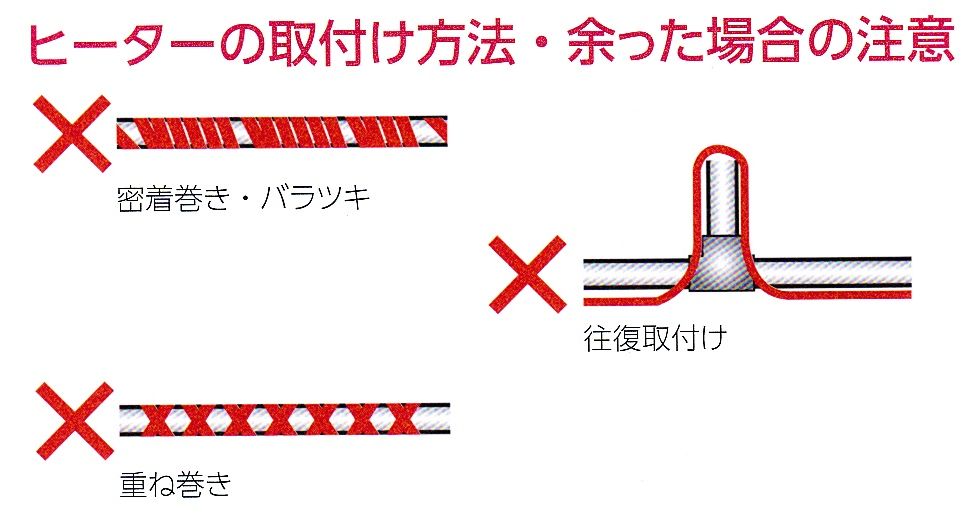 ヒーターを巻いて、余ってしまった場合は、無理に間を詰めて巻かずに、外に出しましょう!