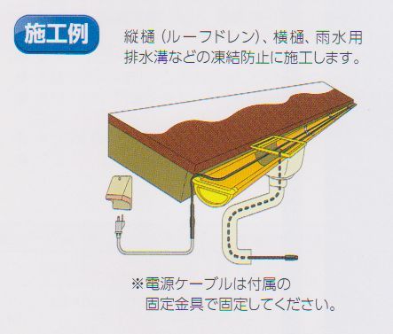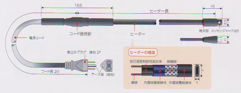※注1)自己温度制御方式について:普段は一定量の電気が流れているがほとんど熱くならない。回りの温度が下がると電流が多くなり、ヒーターの温度が上がって凍結防止などの役割をする。ヒーター自体で温度制御をするので、温度が上がりすぎず、しかも接点が存在しないという特徴がある。ただし、常温でも常に電気は流れているので注意が必要。
